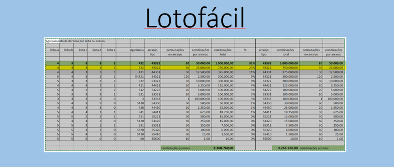 30 % dos sorteios da Lotofácil - cor verde - são observados / Em média a cada 10 sorteios, 1 dentre 400 agrupamentos contendo 645 combinações semelhantes ocorre. Ao longo de 3.250 sorteios, 200 desses 400 diferentes tipos de agrupamento ocorreram, outros poucos recorreram. CERTAMENTE, a cada 25 sorteios uma nova "composição não contemplada" ocorre. Caso ocorra, e você aposte nela, suas chances de acerto está entre 645 combinações em um universo de mais de 3 milhões de possibilidades! VERDADE ABSOLUTA. Um dos 200 agrupamentos que ainda não foi observado dentre os 400 possíveis IRÁ OCORRER nos próximos sorteios