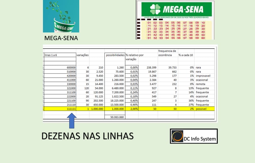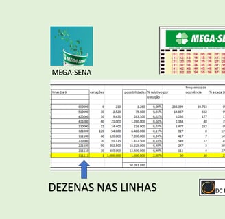 Número do sorteio, jogo, números sorteados - 6 de 60 disponiveis - codigo - linhas com 0,1,2... elementos, localização nas 6 linhas, ........ numeros em colunas....
