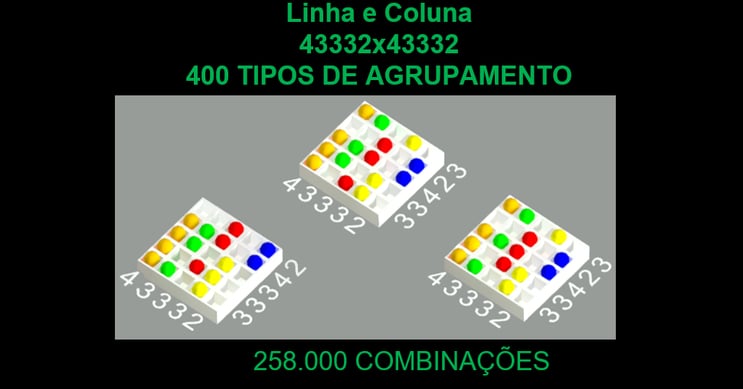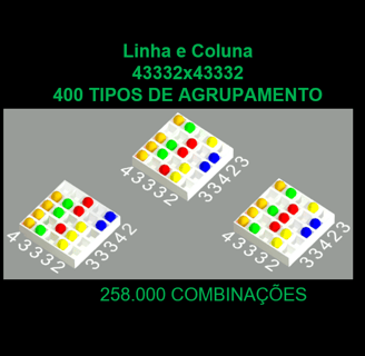 A LOTOFÁCIL combina 15 NUMEROS extraídos de um conjunto de 25 NUMEROS, distribuídos em 5 LINHAS com 5 NÚMEROS SEQUÊNCIAIS - a quantidade de elementos em uma linha pode variar entre 0 e 5 números, indicando 1 dos 5 algarismos que irão caracterizar o TIPO DE AGRUPAMENTO EM LINHA.